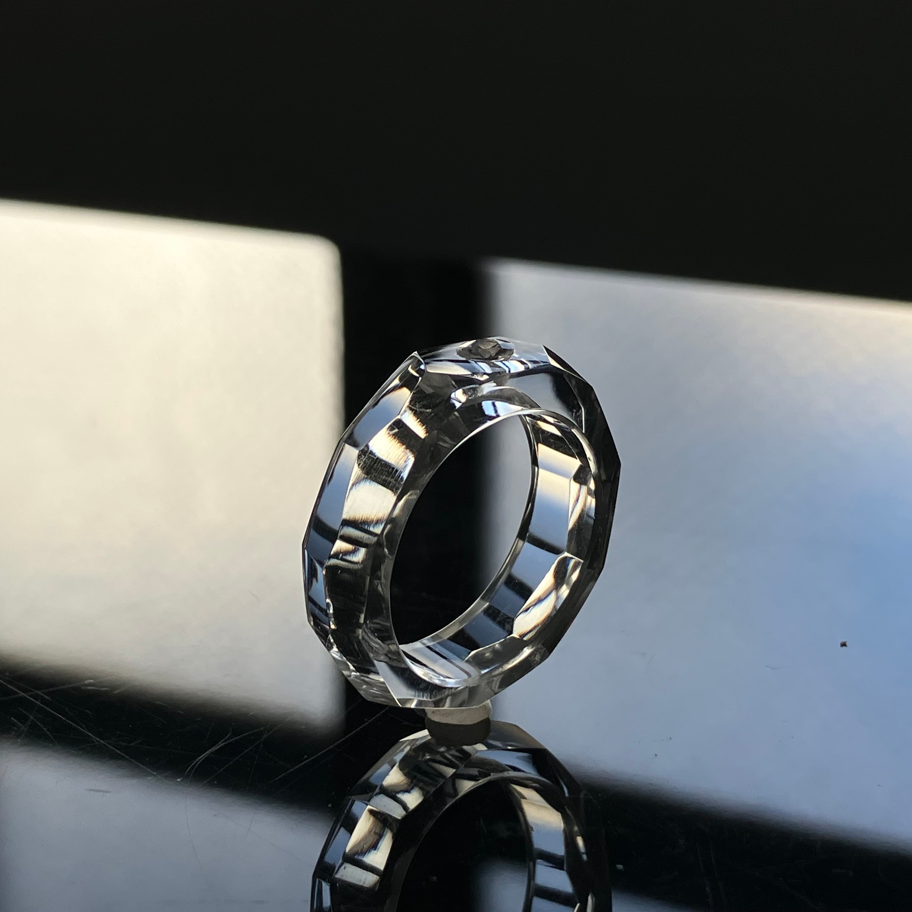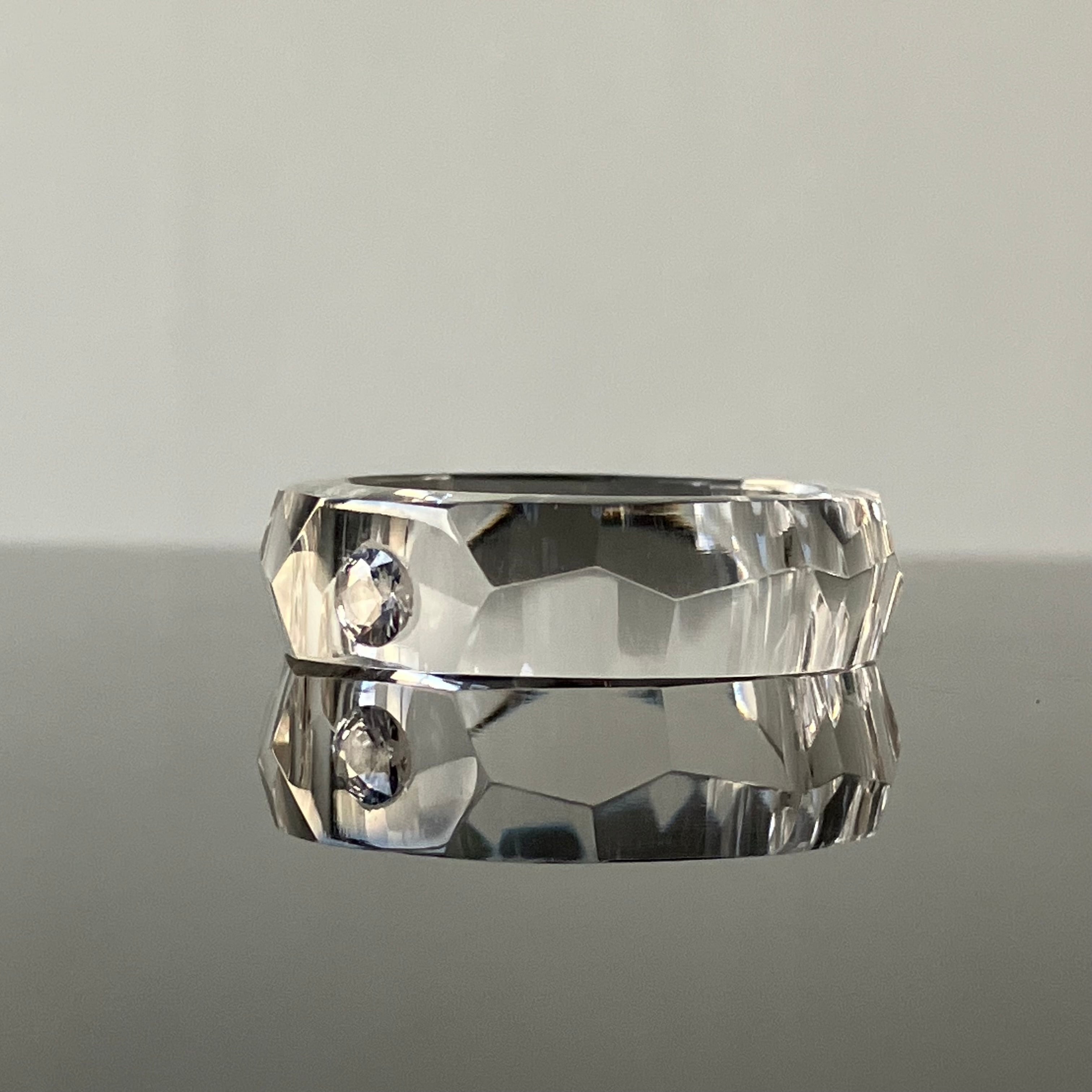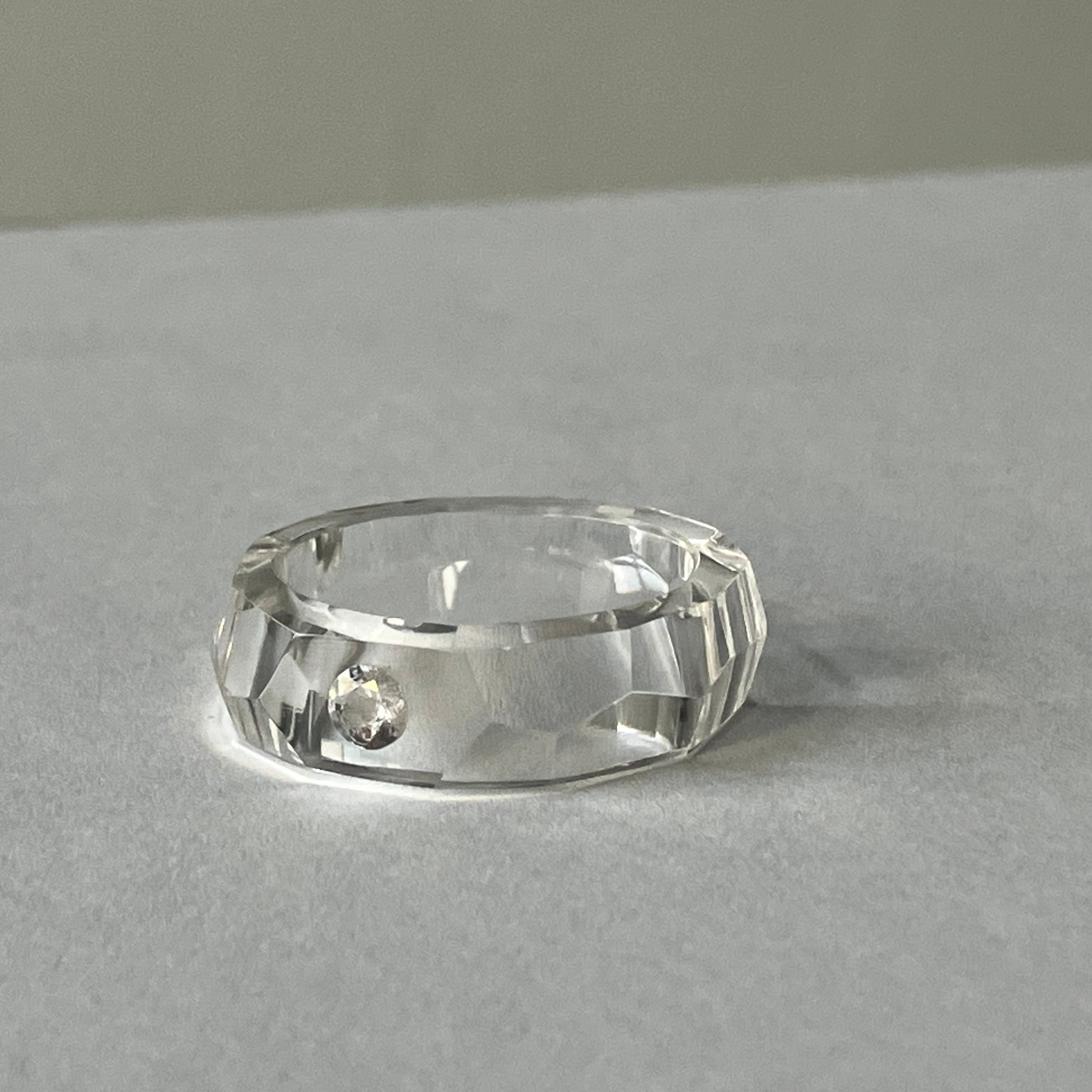 フリーハンドでカットした水晶のくりぬきリングにホワイトサファイアをセットしました。オンオフ問わず幅広いスタイリングにプラス出来るアイテムです。