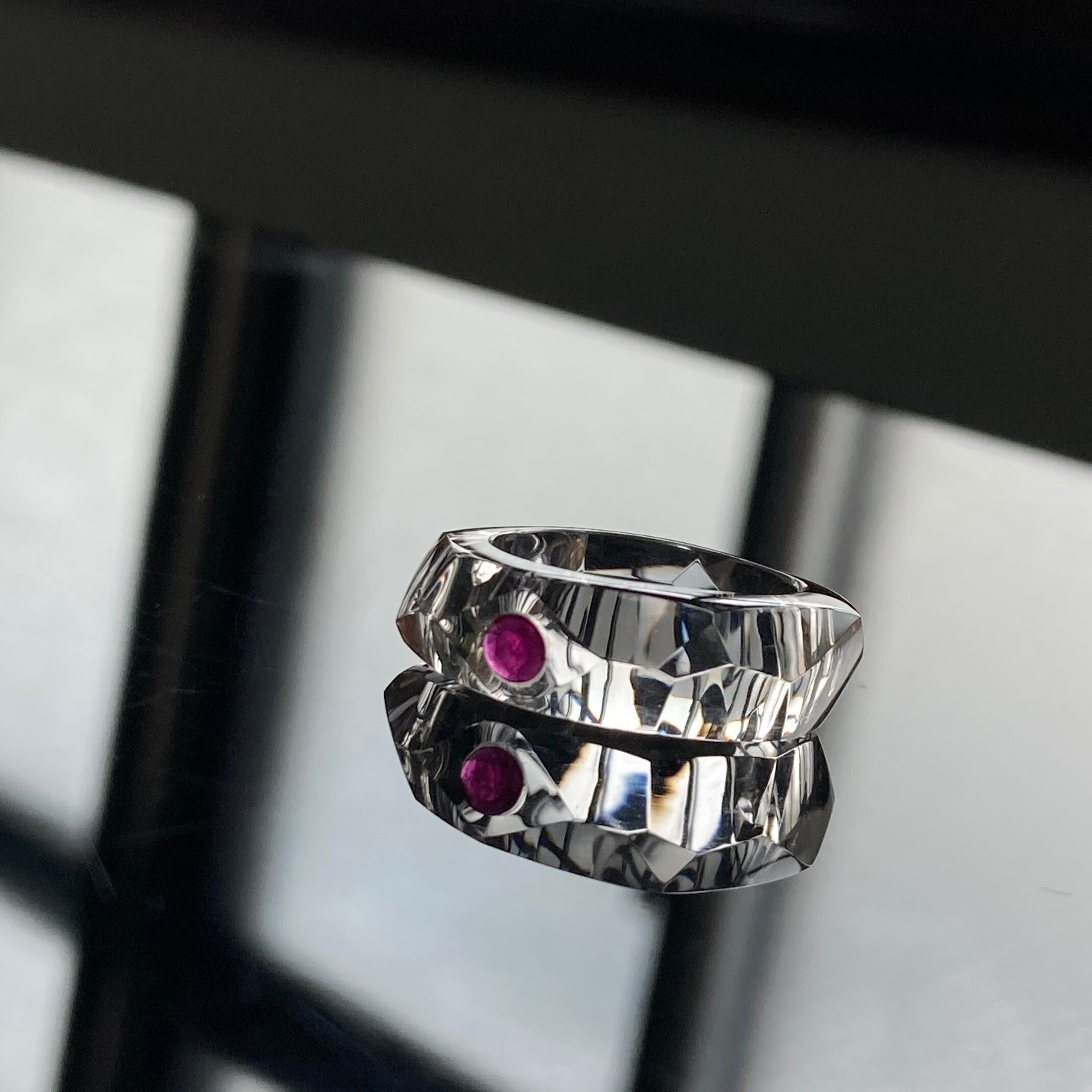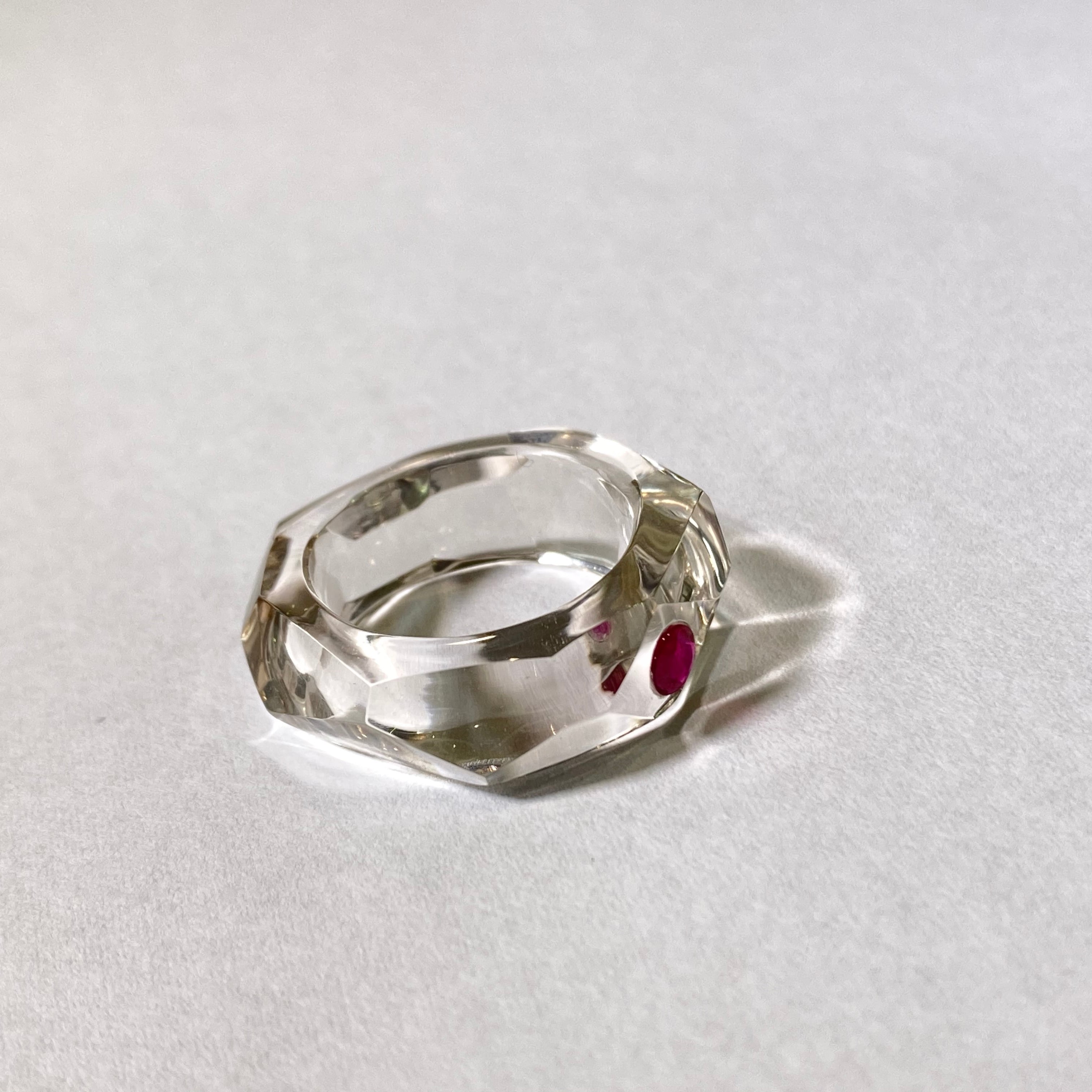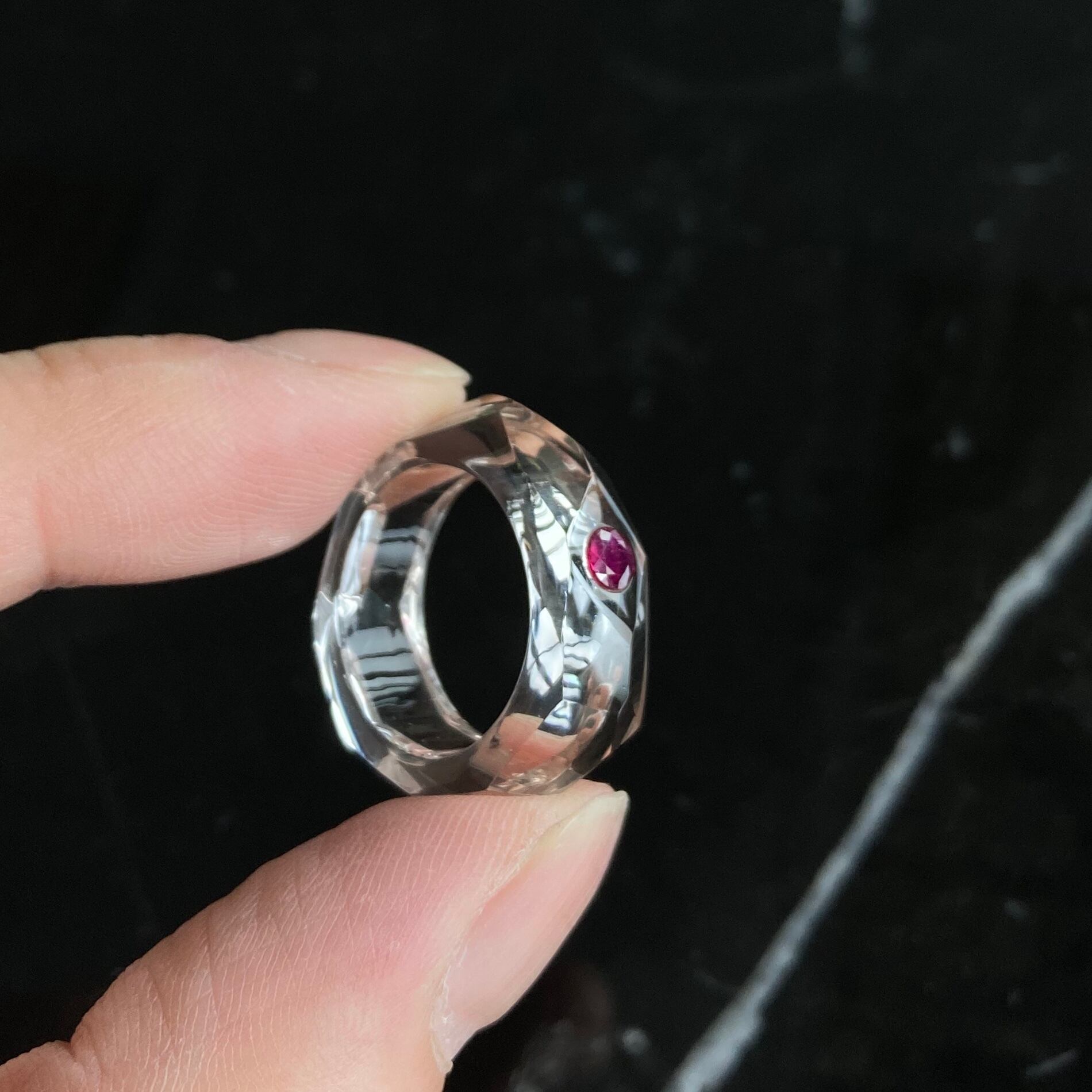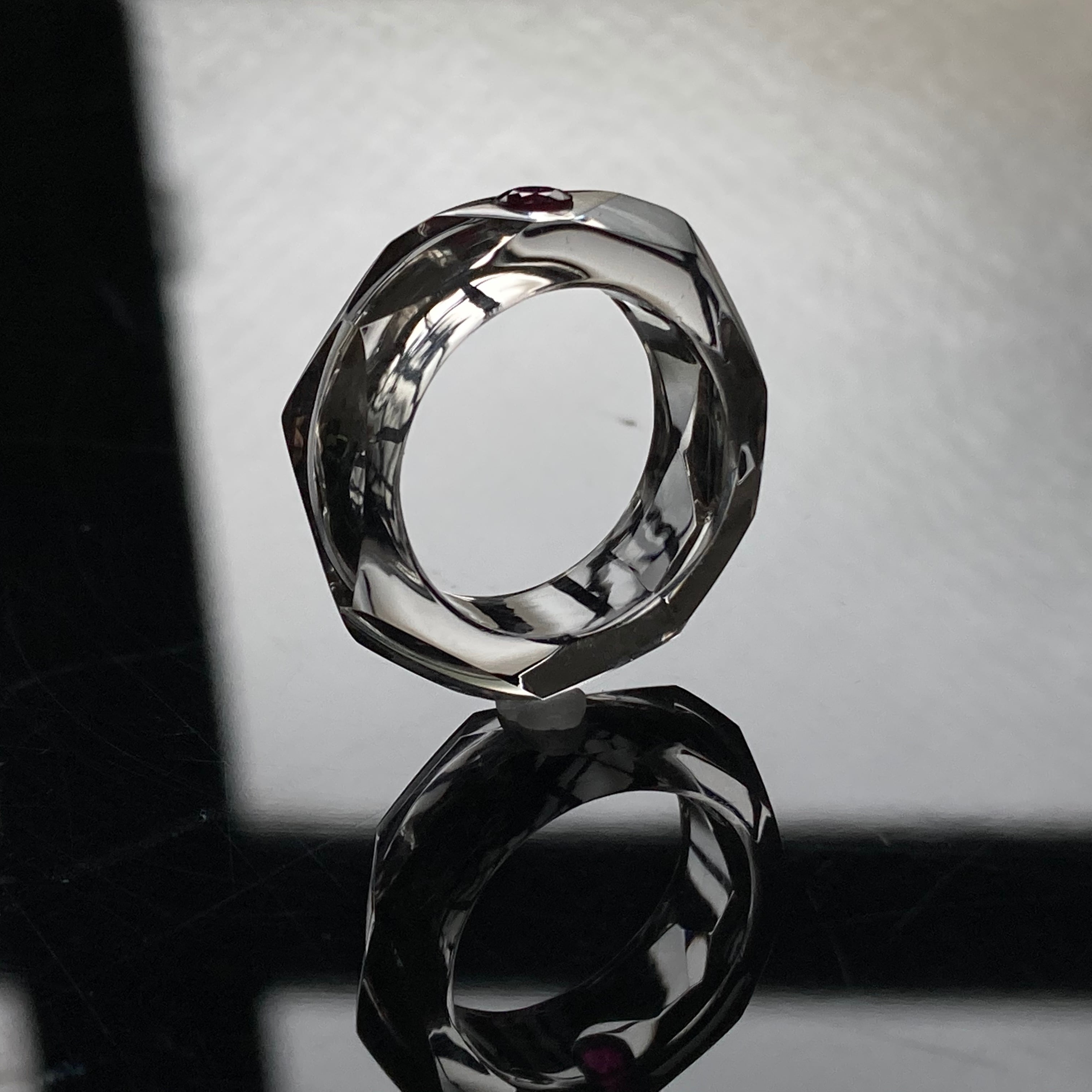 フリーハンドでカットした水晶のくりぬきリングにルビーをセットしました。