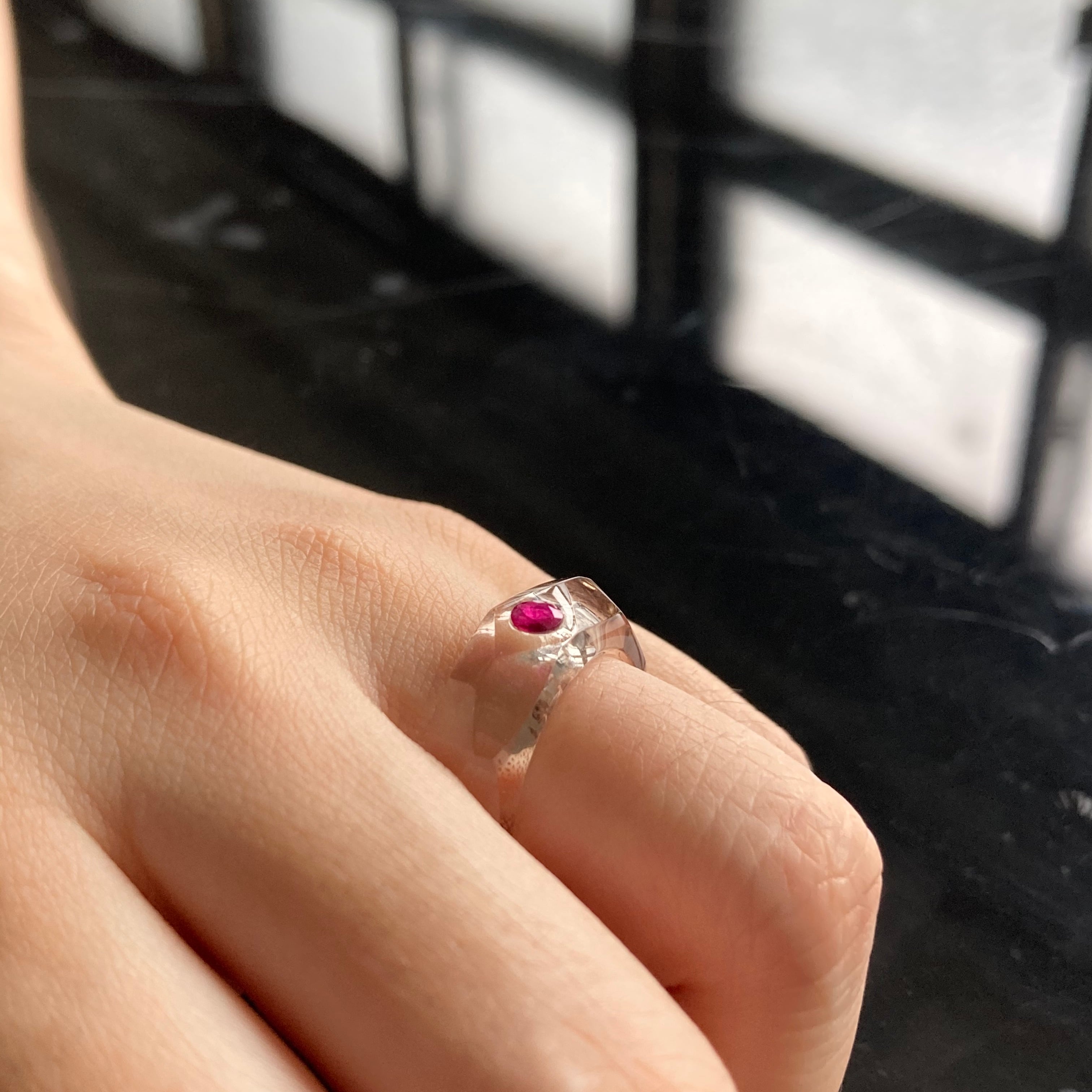 使い勝手の良いフラットなシルエットな水晶のリングに活力の感じられるレッドのルビーが斬新さを引き立てます。オンオフ問わず幅広いスタイリングにプラス出来るアイテムです。