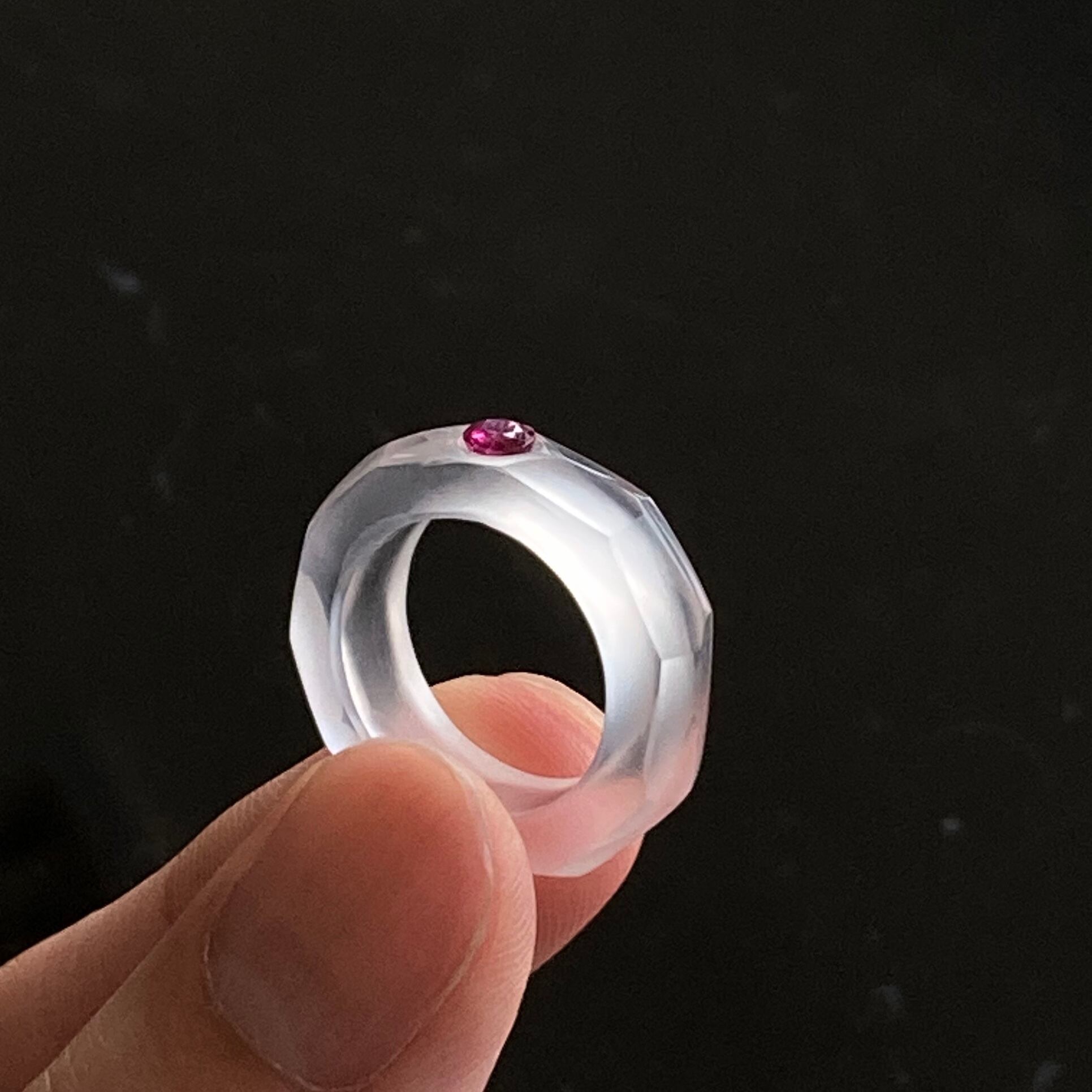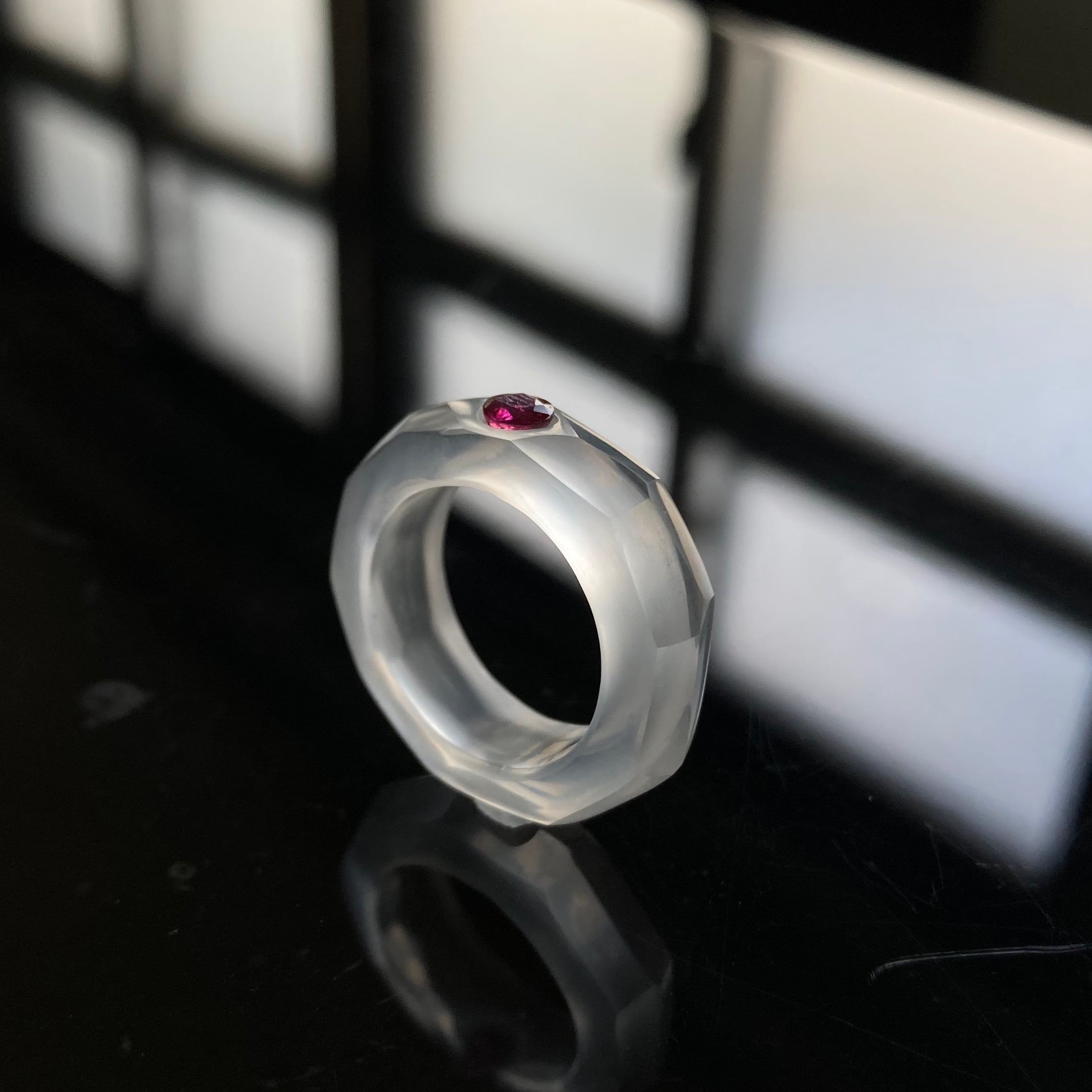 フリーハンドでカットした水晶のくりぬきリングにルビーをセットしました。