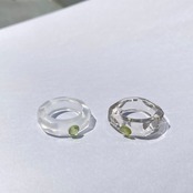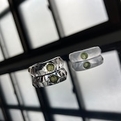 使い勝手の良いフラットなシルエットな水晶のリングに爽やかなグリーンのペリドットが斬新さを引き立てます。オンオフ問わず幅広いスタイリングにプラス出来るアイテムです。