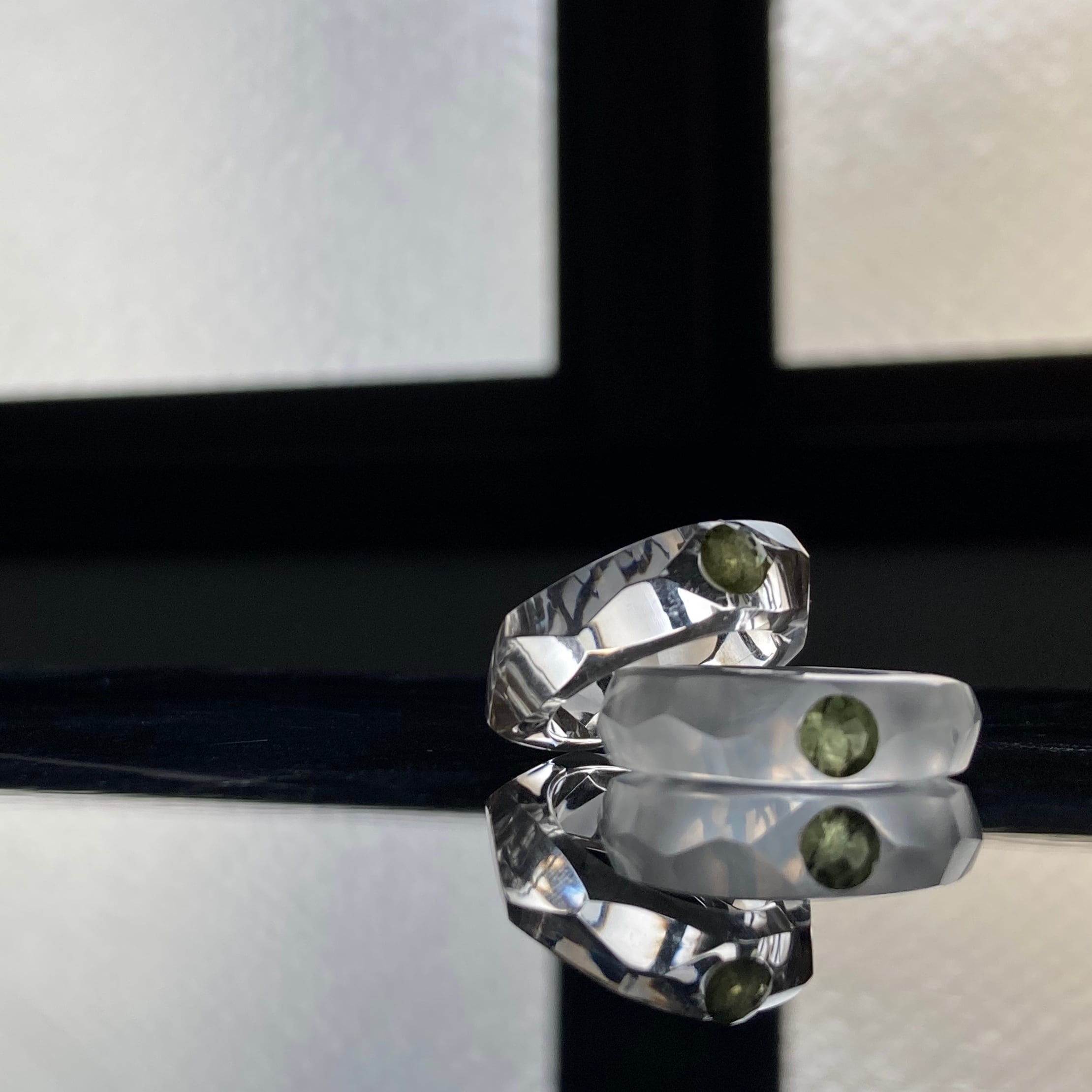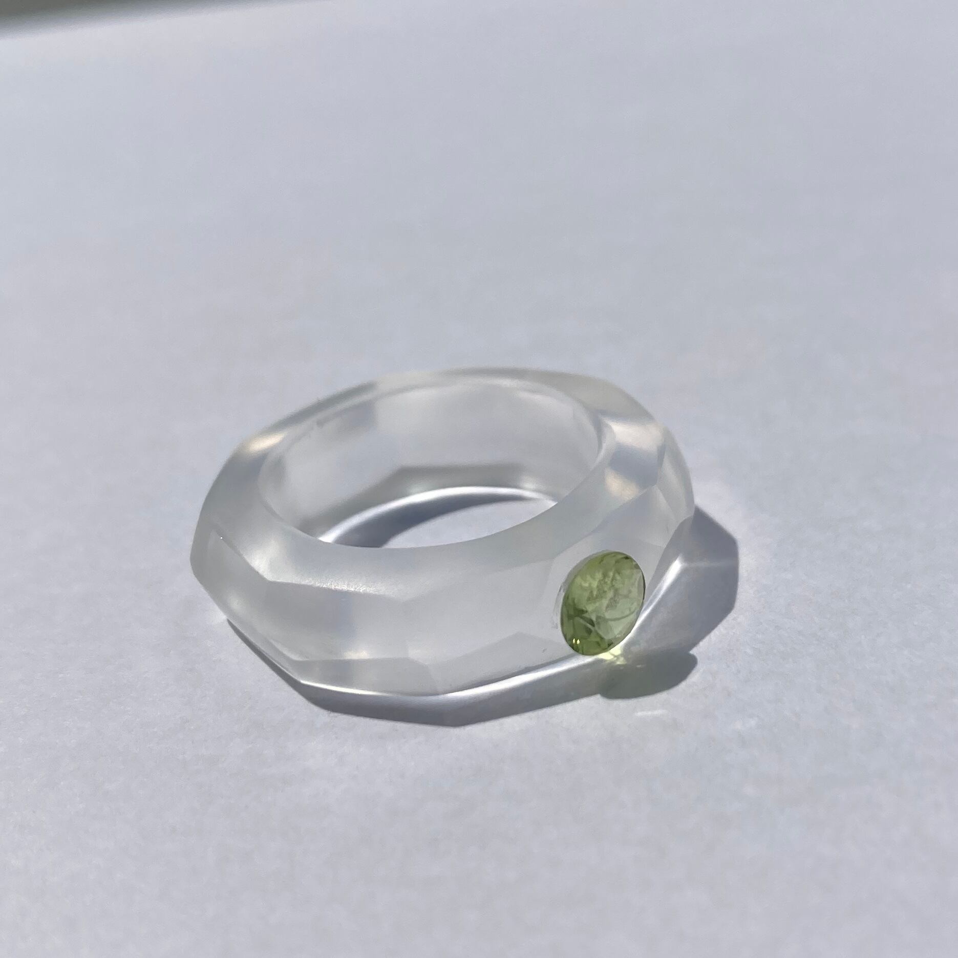 フリーハンドでカットした水晶のくりぬきリングにペリドットをセットしました。