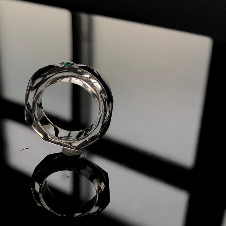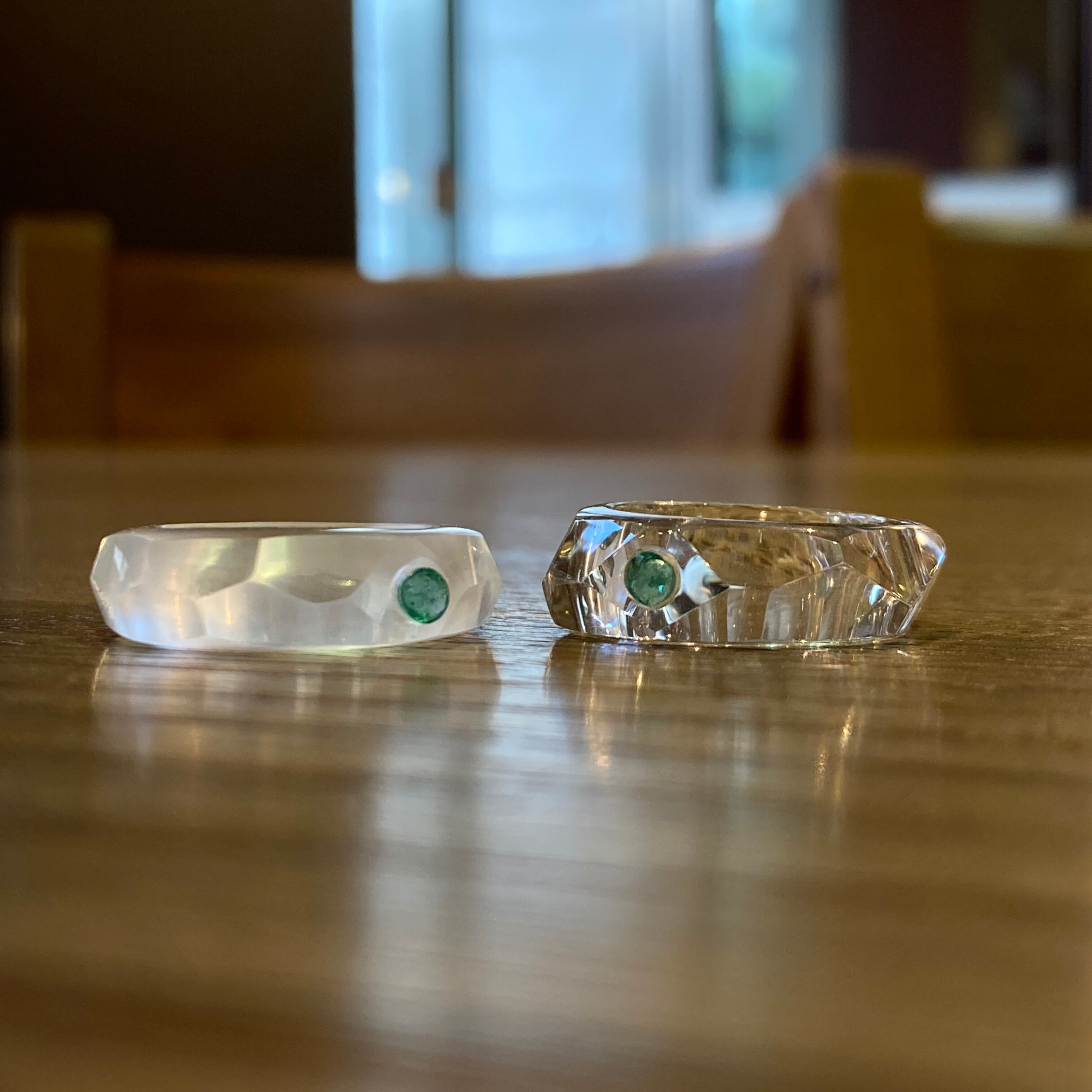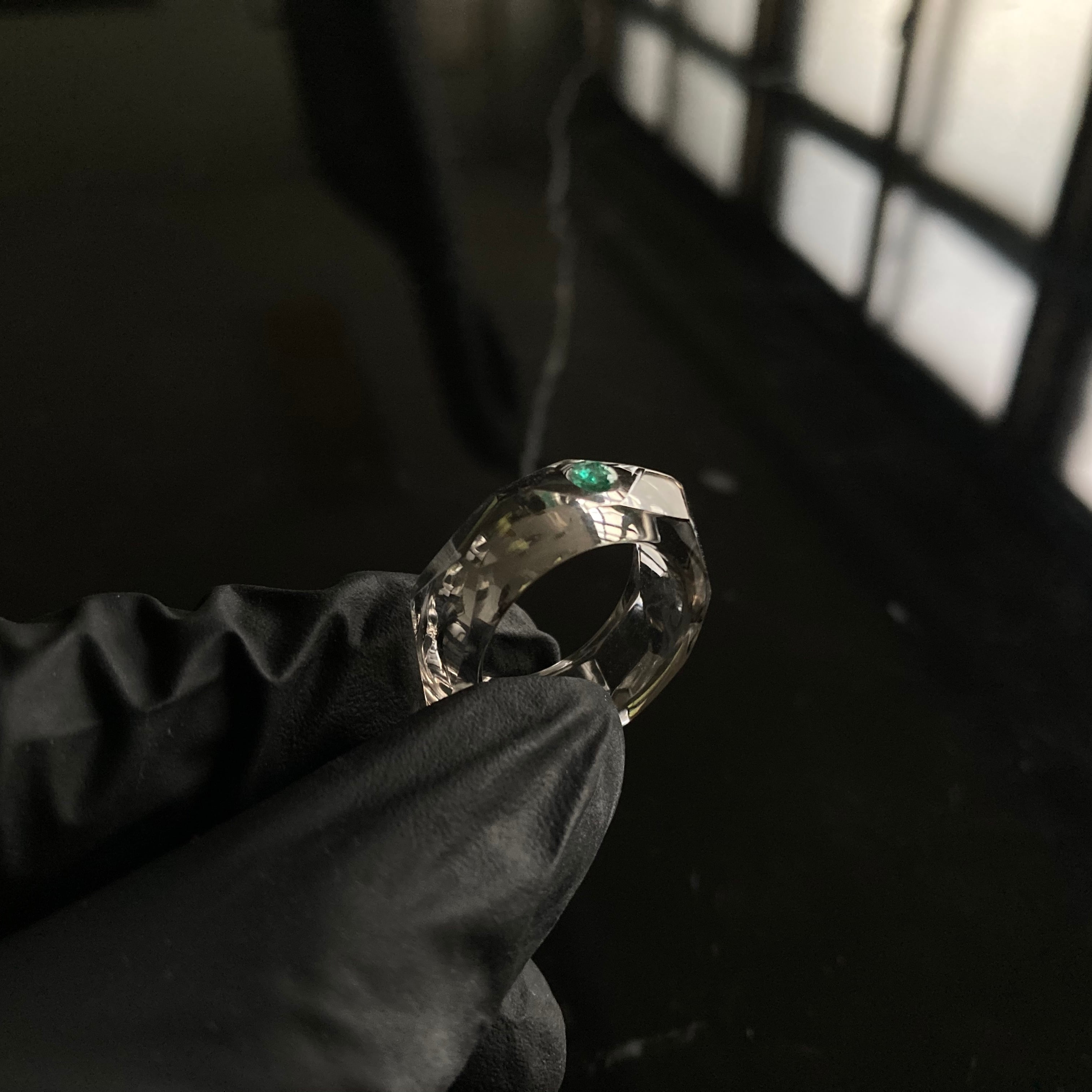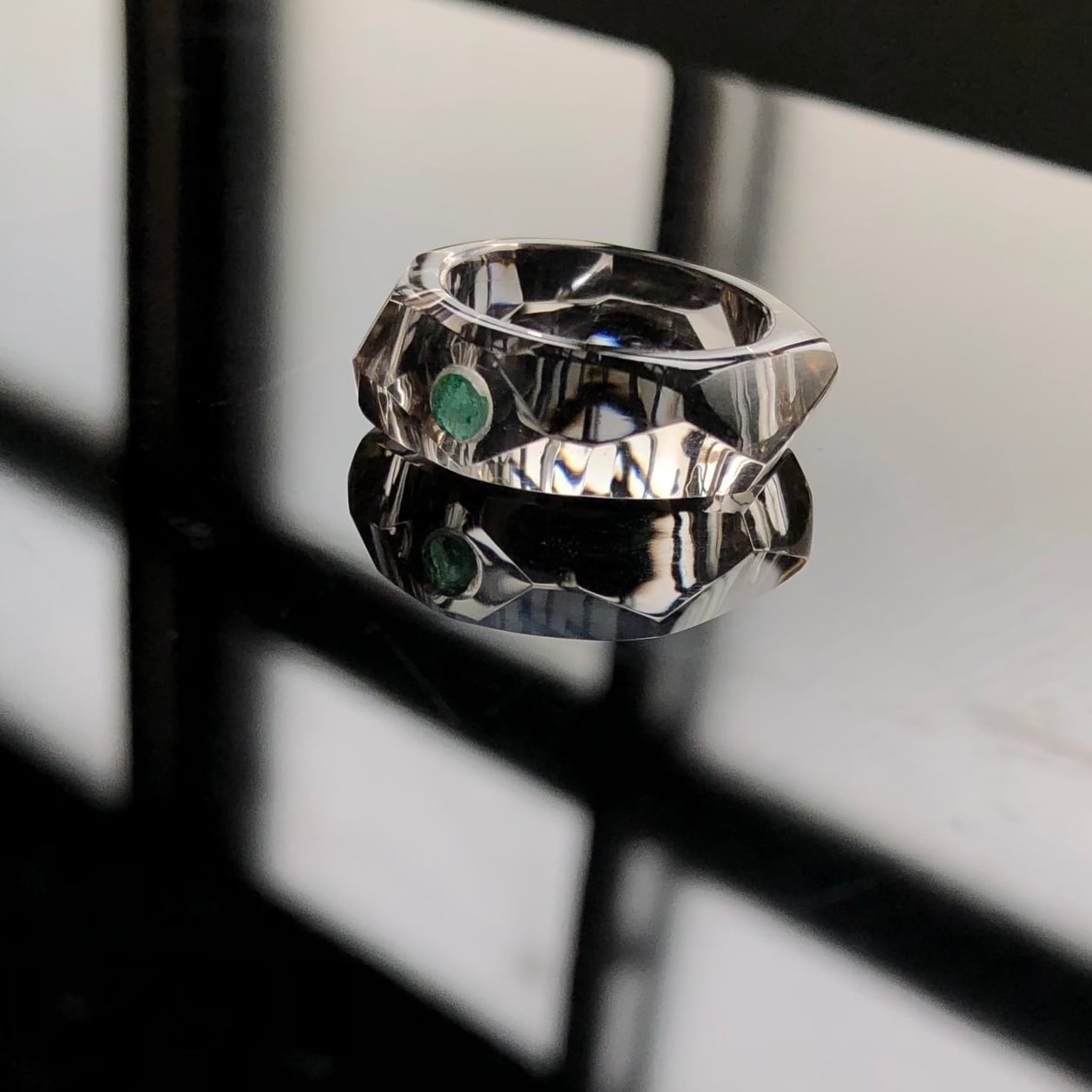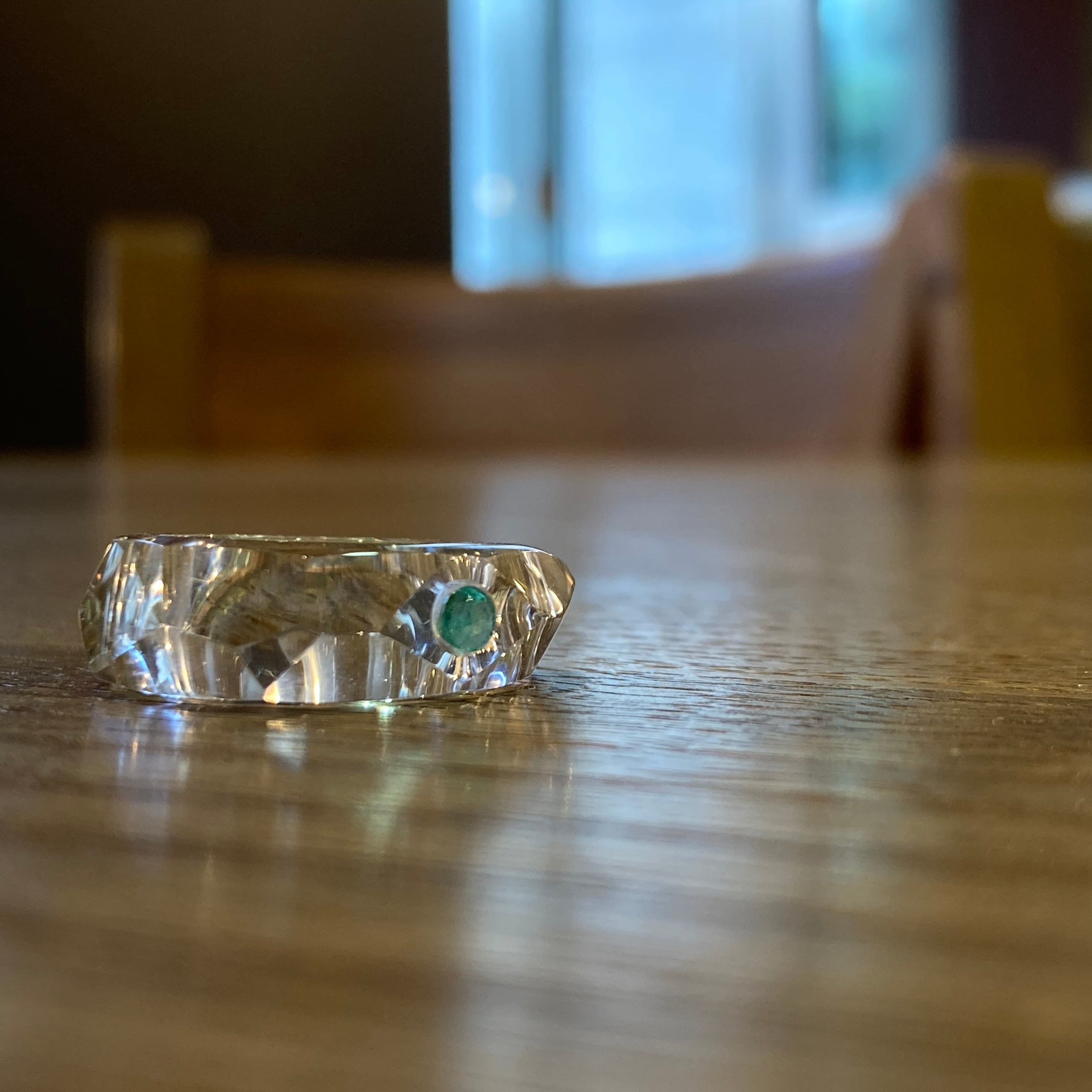 フリーハンドでカットした水晶のくりぬきリングにエメラルドをセットしました。
