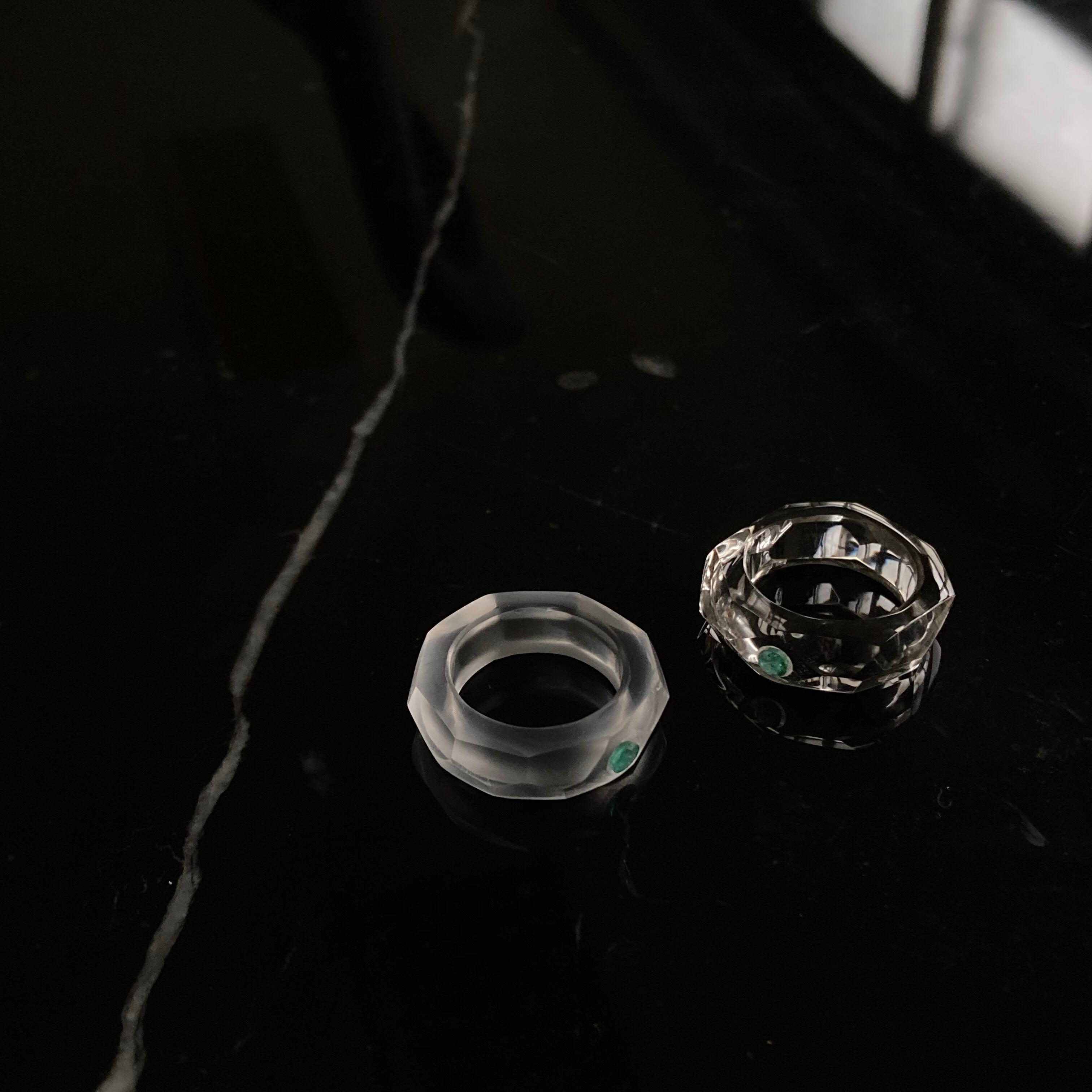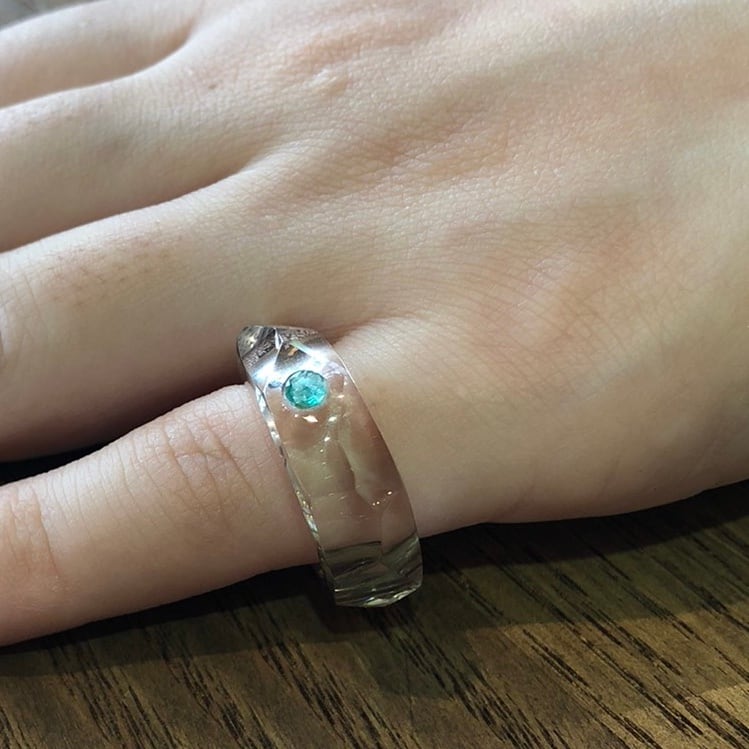 使い勝手の良いフラットなシルエットな水晶のリングに爽やかなグリーンのエメラルドが斬新さを引き立てます。オンオフ問わず幅広いスタイリングにプラス出来るアイテムです。