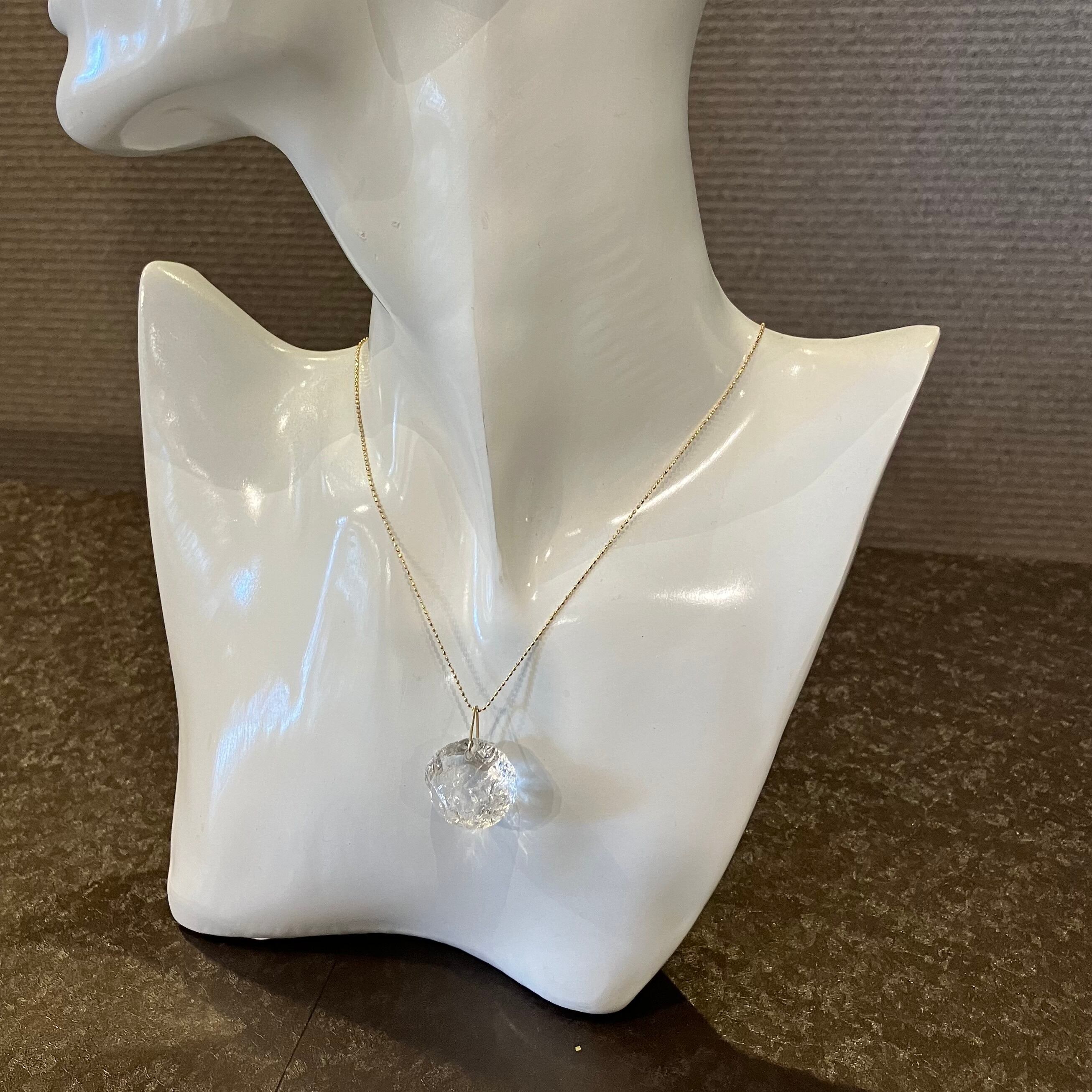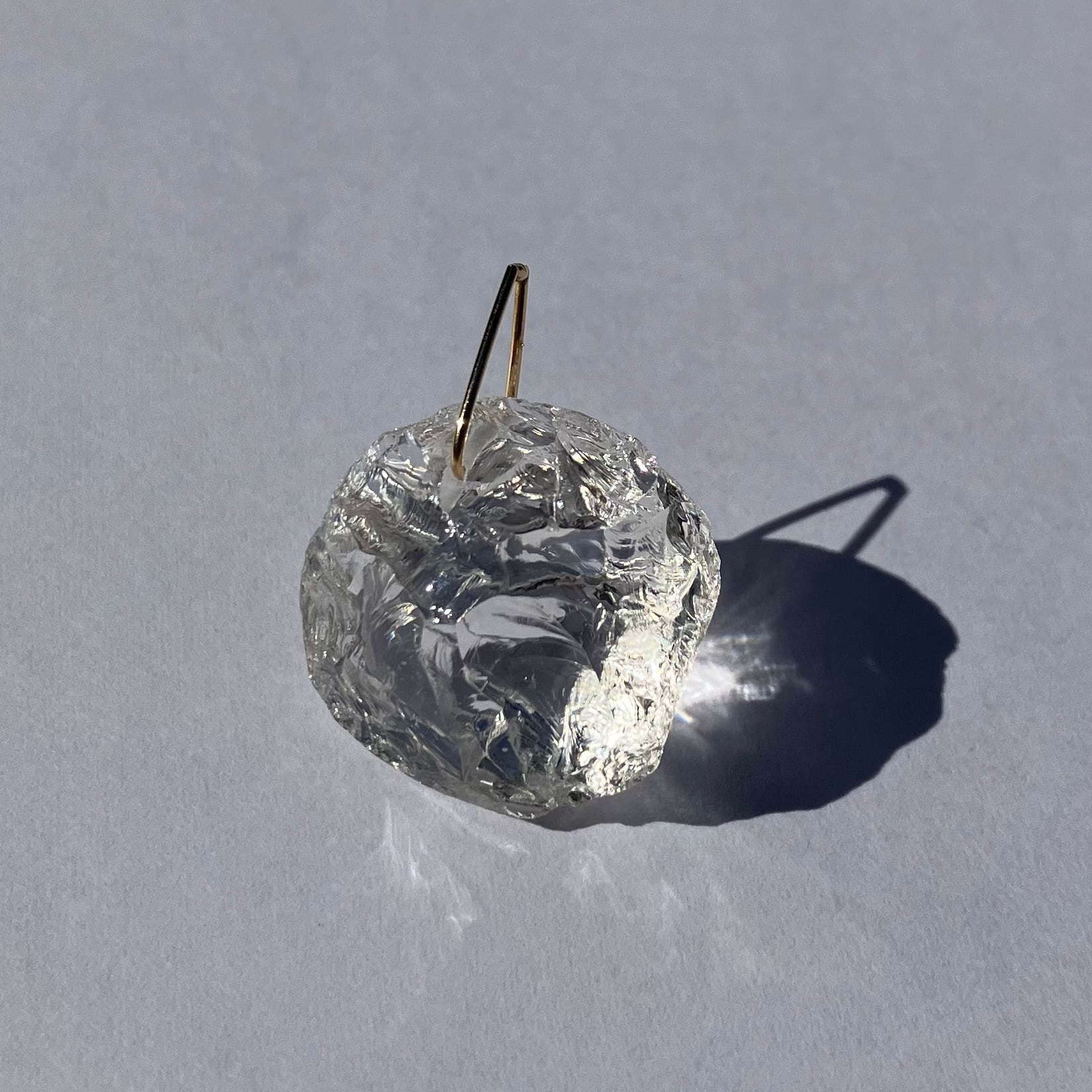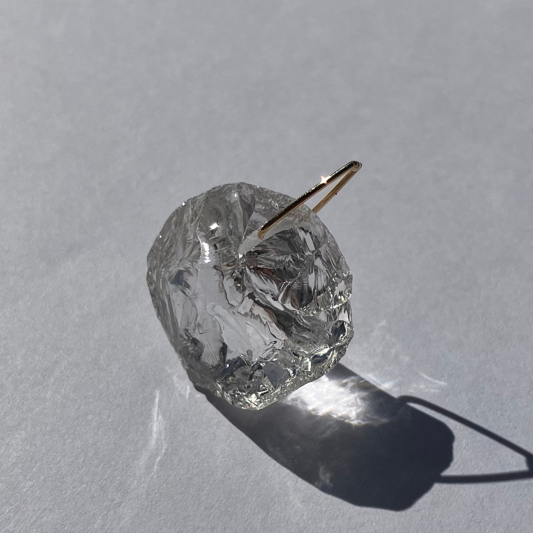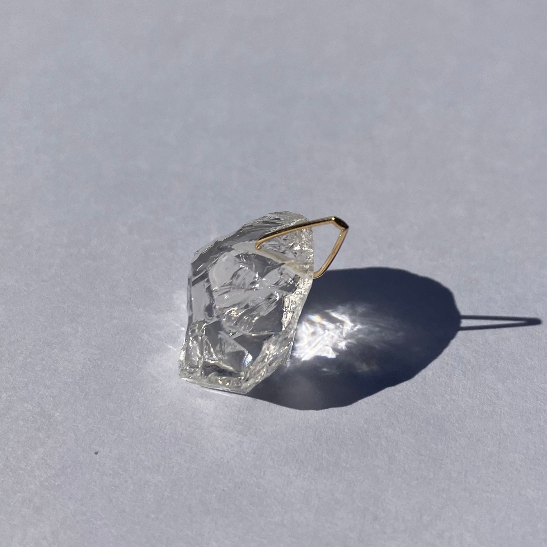 かちわり水晶のペンダントトップです。人工的に割った水晶の断面はとても美しく透明感があり、涼しげな氷の塊のようです。原石の状態では、鋭利な部分もあり洋服に引っかかる恐れがあるため、気になる箇所は少し研磨しております。それにより、見た目に反して手触りはソフトです。金線の色をK18YG(金色)とプラチナ(銀色)からお選びいただけます。