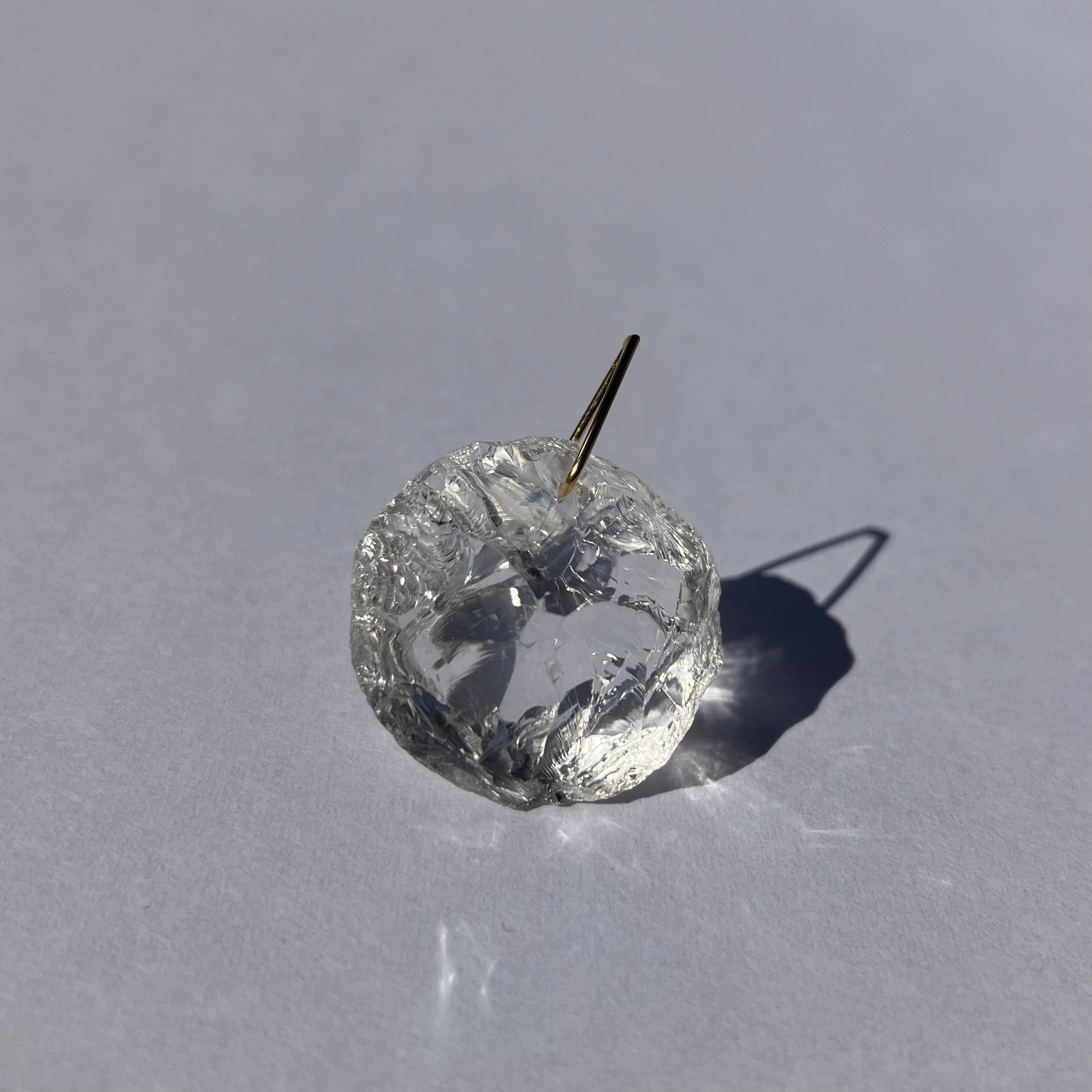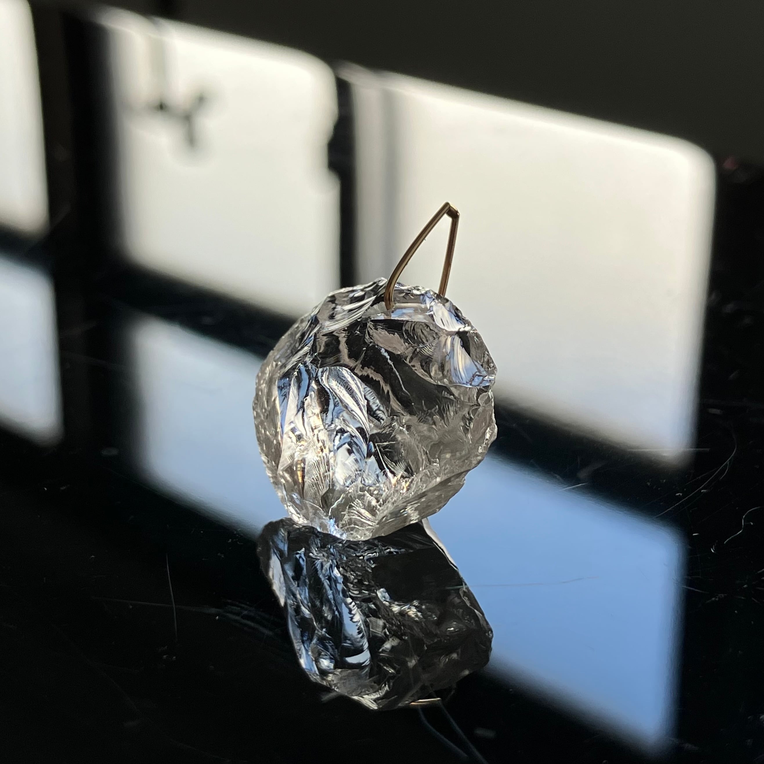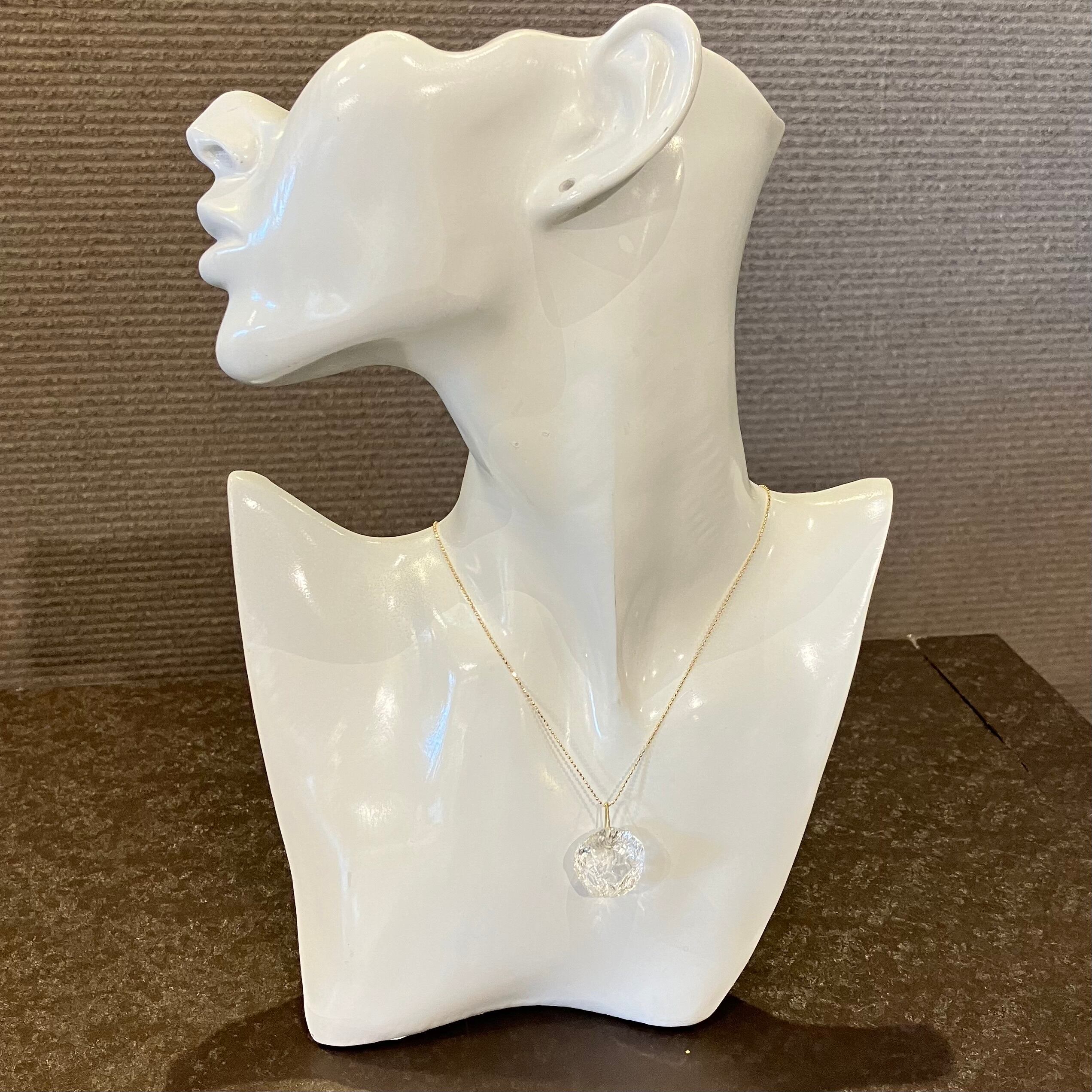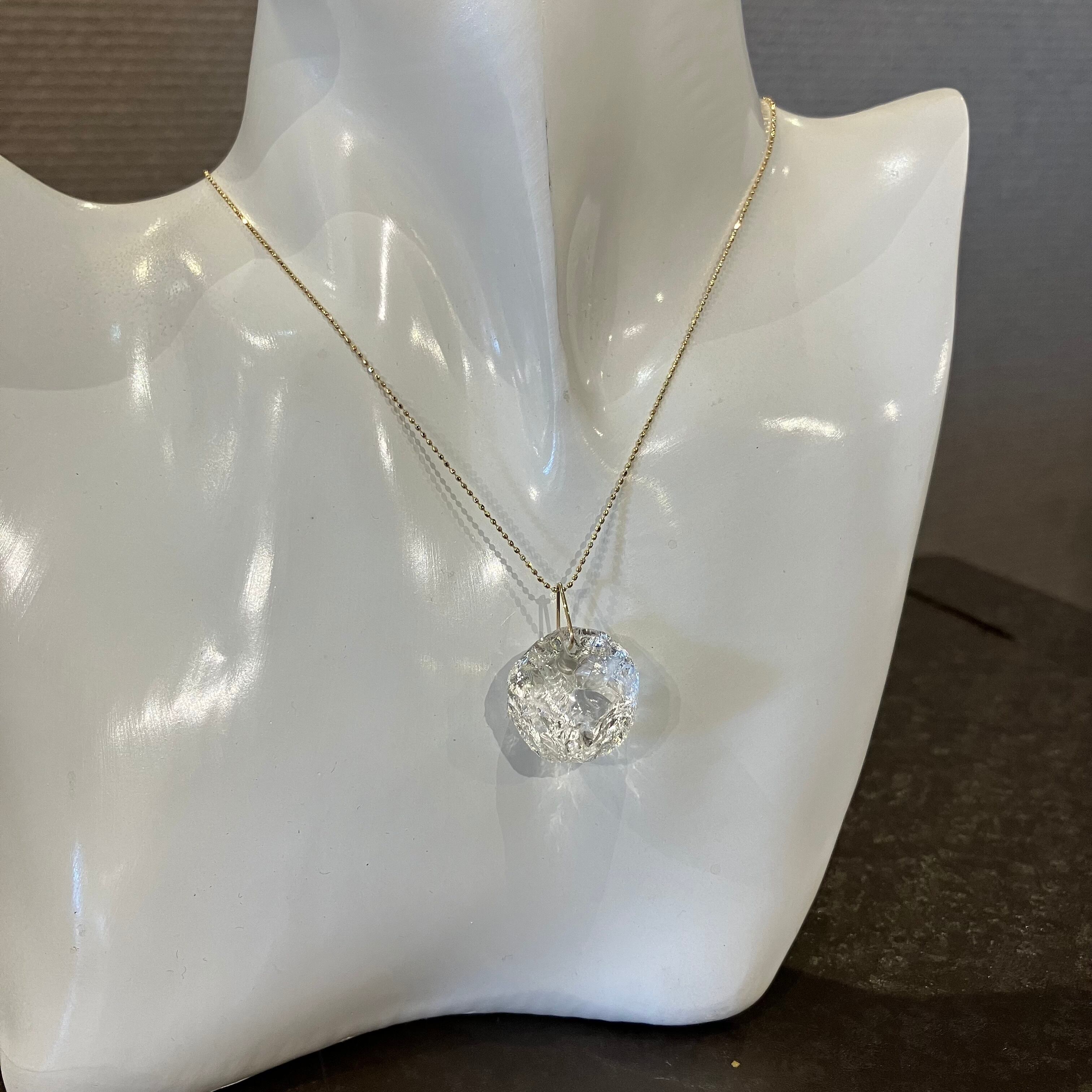 かちわり水晶のペンダントトップです。人工的に割った水晶の断面はとても美しく透明感があり、涼しげな氷の塊のようです。原石の状態では、鋭利な部分もあり洋服に引っかかる恐れがあるため、気になる箇所は少し研磨しております。それにより、見た目に反して手触りはソフトです。金線の色をK18YG(金色)とプラチナ(銀色)からお選びいただけます。
